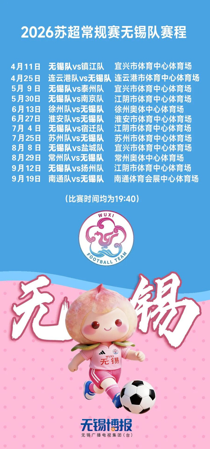 根据赛程安排,今年“苏超”常规赛共78场。除常州VS南通揭幕战于19:35开球外,其余场次均固定在周六19:40开赛。无锡队6个主场(宜兴、江阴各3场)将依次上演精彩对决。若能闯入四强,球队还将在淘汰赛阶段拥有2个主场优势,让更多球迷有机会现场为家乡球队呐喊助威。