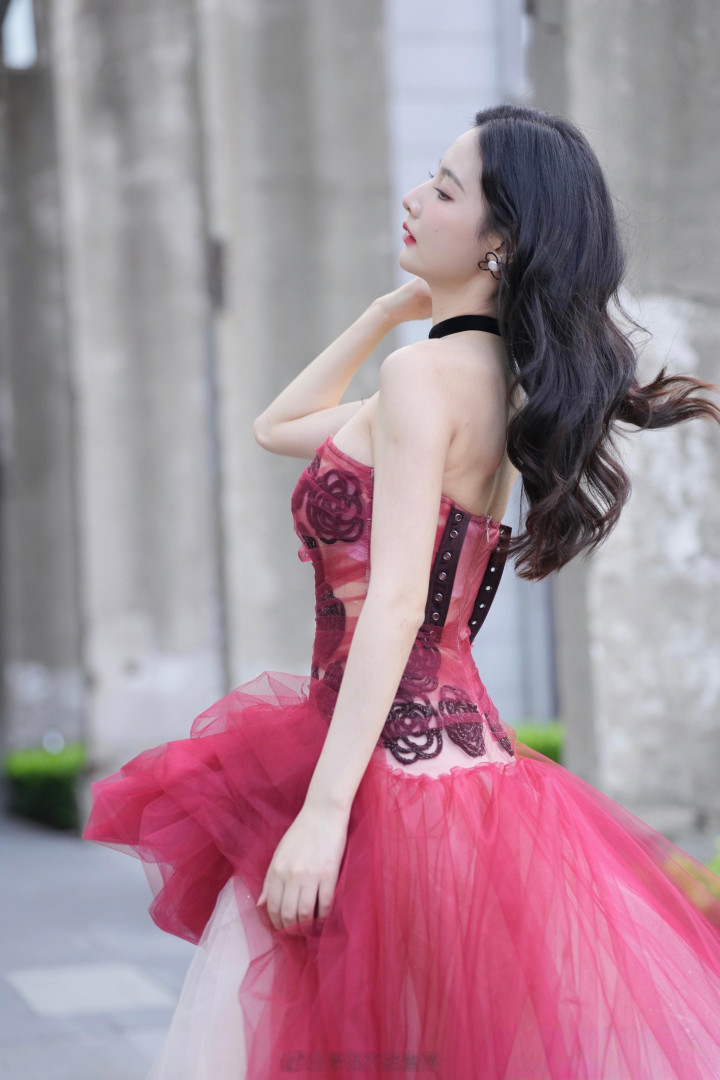 许久未见,赵粤也是长大了,穿玫瑰抹胸裙秀曲线,美背白到发光!