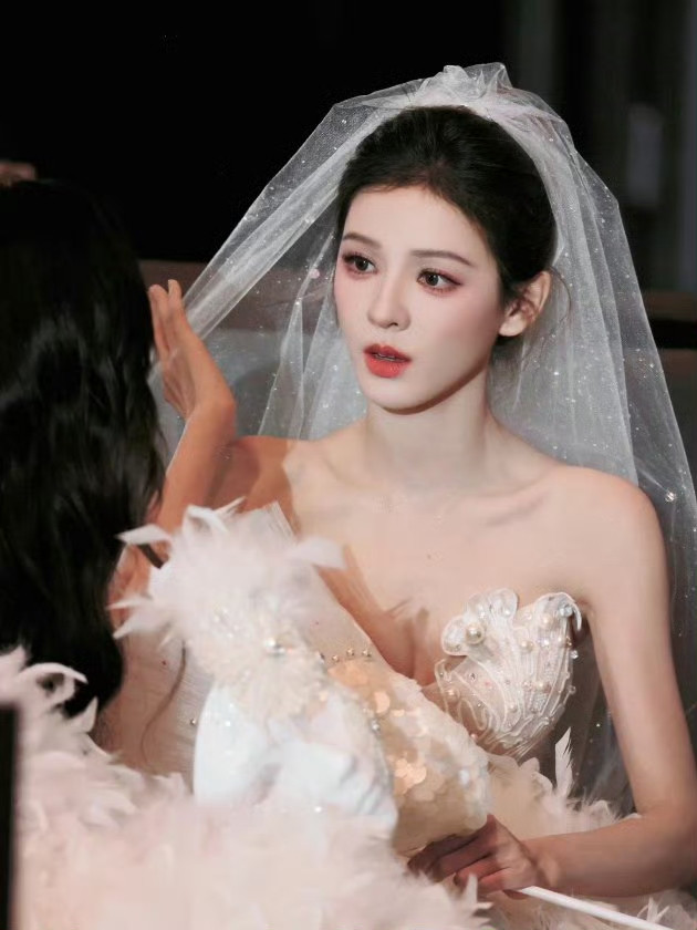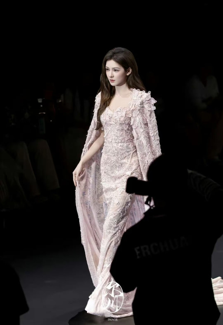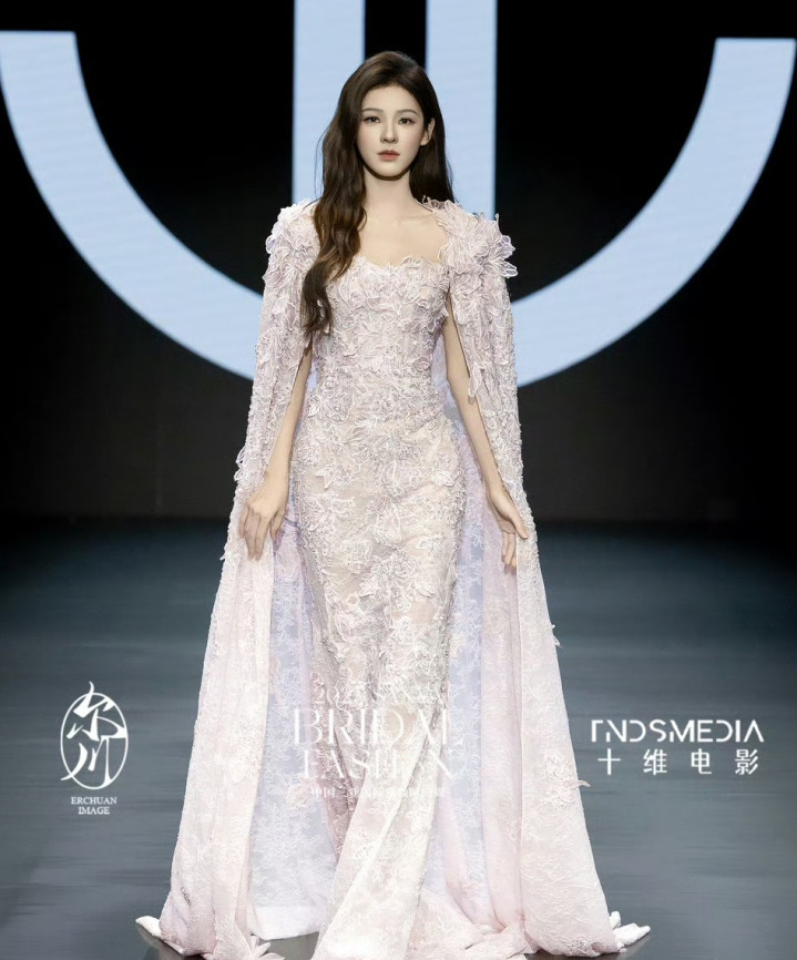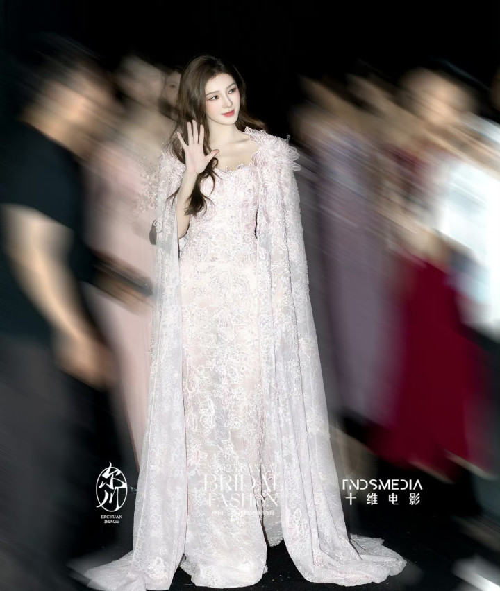 浅粉抹胸蕾丝裙勾勒出流畅腰臀线,外层缀满立体刺绣,走动时裙摆漾开的弧度,像裹着一层软绵的粉雾。