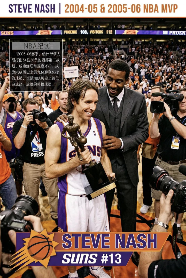④、2005——2006赛季,史蒂夫·纳什在核心队友阿马雷·斯塔德迈尔赛季仅打3场就报销的情况下,依然带领菲尼克斯太阳队打出54胜28负的西部第2战绩,场均10.5次助攻蝉联联盟助攻王,成功蝉联常规赛MVP,成为NBA历史上第9位蝉联 MVP的球员,也是NBA历史上首位完成这一成就的外籍球员。