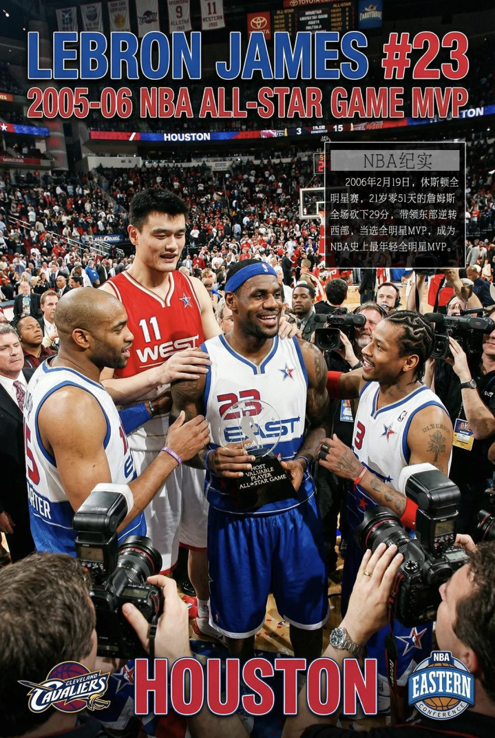 ⑥、2006年2月19日休斯敦全明星赛,21岁零51天的勒布朗·詹姆斯全场砍下29分,带领东部明星队以122:120逆转西部明星队,并当选全明星赛MVP,成为NBA历史上最年轻的全明星赛MVP,该纪录保持至今。