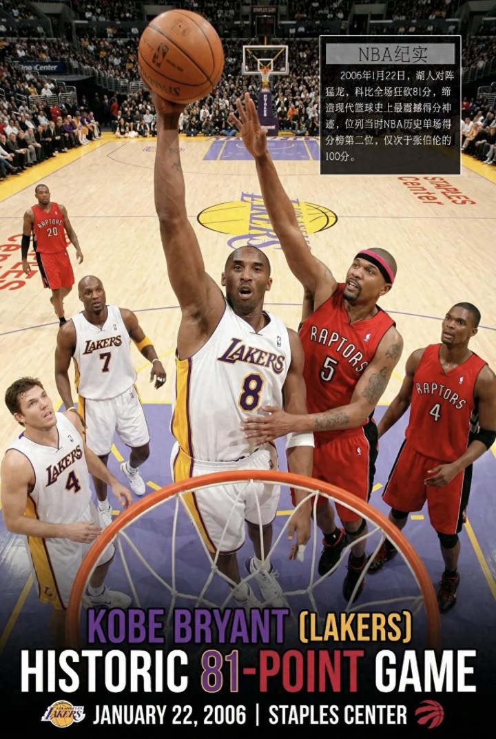 ①、2006年1月22日,洛杉矶湖人队对阵多伦多猛龙队的常规赛中,科比·布莱恩特全场46投28中,三分球13投7中,罚球20罚18中,疯狂砍下81分,位列 NBA 当时历史单场得分榜第二位,仅次于威尔特·张伯伦的100分。此前他还在对阵达拉斯小牛队(现已更名为:达拉斯独行侠队)的比赛中3节砍下62分,得分超过达拉斯小牛全队3节总得分。当赛季,科比·布莱恩特场均35.4分,职业生涯首次斩获常规赛得分王,创下自迈克尔・乔丹之后NBA单赛季场均最高得分纪录。