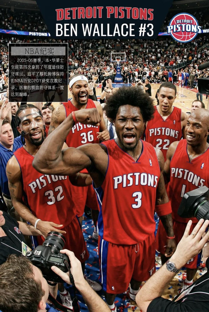 ③、2005——2006赛季,本·华莱士职业生涯第4次拿到年度最佳防守球员(DPOY),追平了迪肯贝·穆托姆博保持的NBA历史DPOY获奖次数纪录,底特律活塞队铁血防守体系达到巅峰。