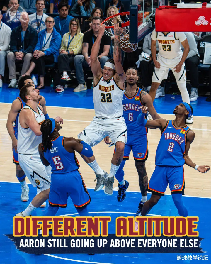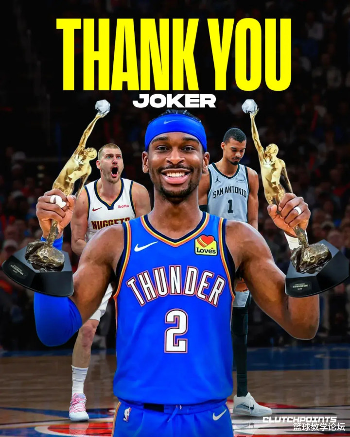 约基奇的个人数据依然是联盟最强,本赛季场均篮板、助攻、和进攻效率都是联盟第一。亚历山大场均正负值联盟第一,场均得分联盟第二,净效率联盟第四。他的优势在于球队战绩,雷霆提前锁定联盟第一,领先掘金12个胜场。