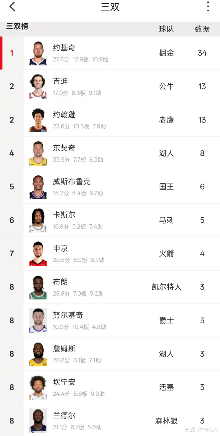 掘金的主动权在自己手里,只要连胜雷霆和马刺,就能锁定西部第三,不用管湖人怎么样。以常规赛12连胜迎接季后赛,掘金全队士气也能得到提升。约基奇本赛季已经34次拿到三双,断档式领跑联盟,三双次数等于2-4名之和。