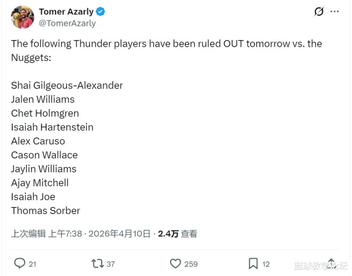 北京时间4月10日,雷霆官方更新了球队伤病报告,明天对阵掘金,雷霆有10人休战: