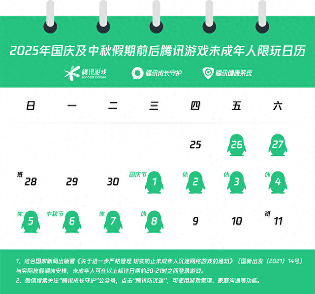 腾讯游戏发布关于国庆及中秋假期前后未成年人游戏限玩的通知,结合国家新闻出版署《关于进一步严格管理切实防止未成年人沉迷网络游戏的通知》(国新出发〔2021〕14号)与实际放假调休安排,2025年国庆及中秋假期前后,腾讯游戏旗下在中国大陆地区运营的网络游戏面向未成年人的游戏限玩执行如下: