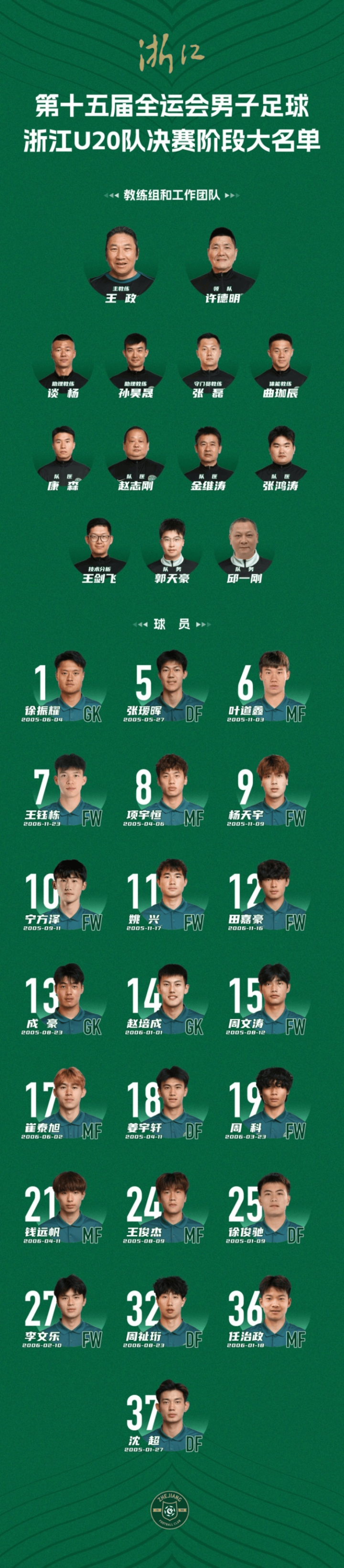 虎扑10月28日讯第十五届全运会即将展开男足U20决赛阶段的较量,浙江队今日公布参赛名单,王钰栋在列。